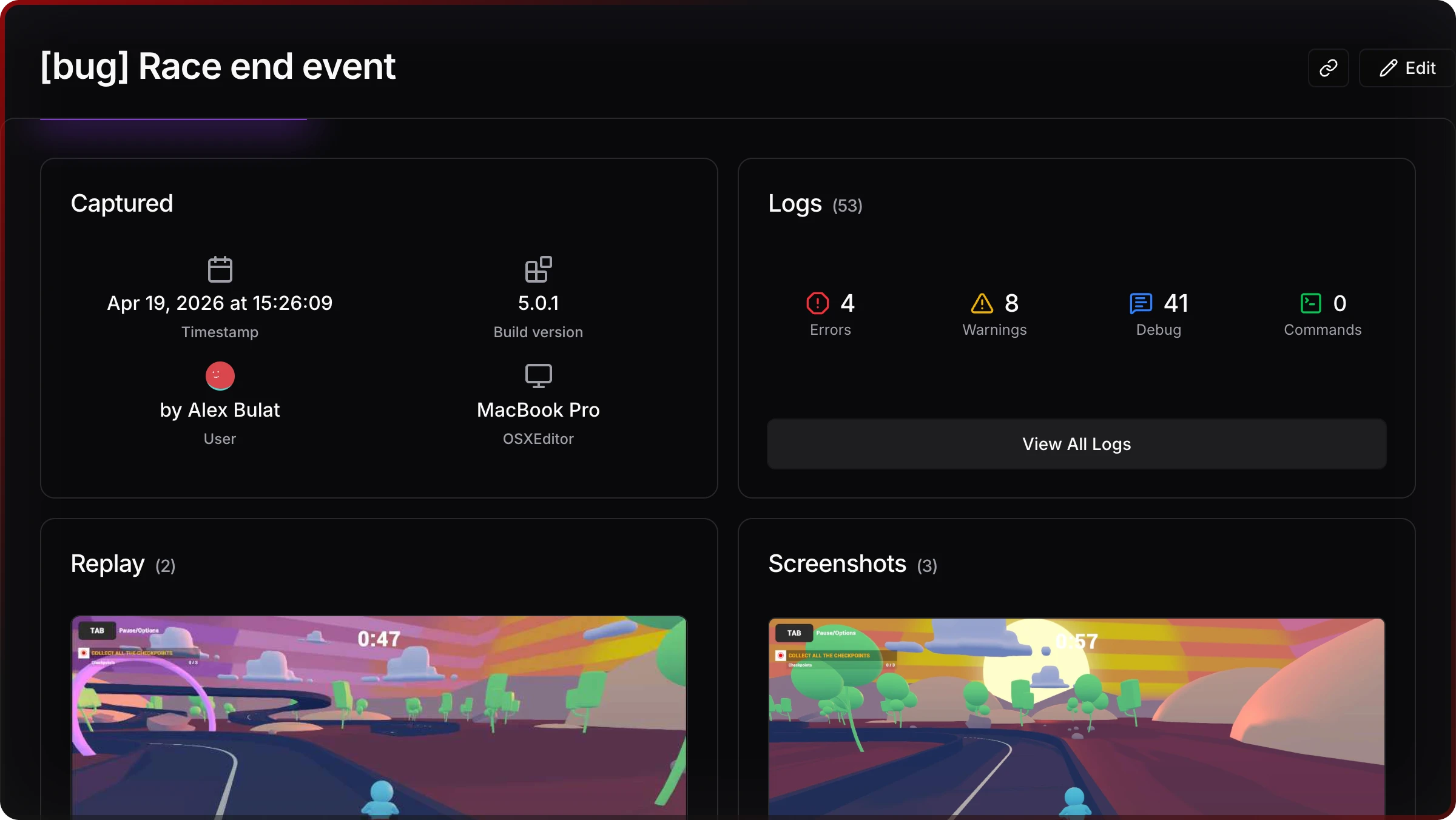Every question you'd ask in a triage call — what was on screen when this log fired?, what happened right before the crash? — answered in one browser tab. Jordan forwards one link; Viktor sees less calendar lost to repro theater.